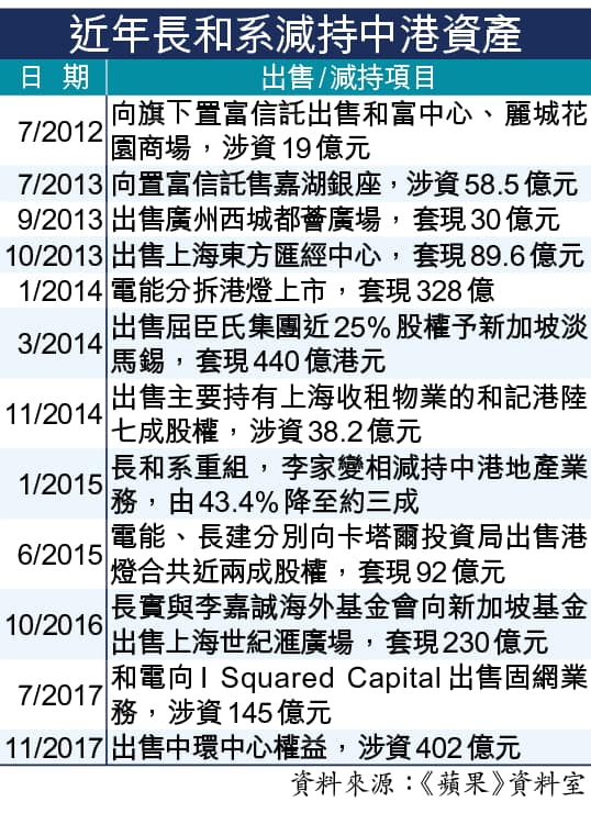而李嘉誠在投資科技的同時,也不斷減持中港的地產項目,當中又以電能實業分拆港燈上巿、出售屈臣氏予淡馬錫、出售中環中心套現400億港元。以上種種的交易,也證明他開始脫離中港的資產,而進一步投資歐洲美洲等地。